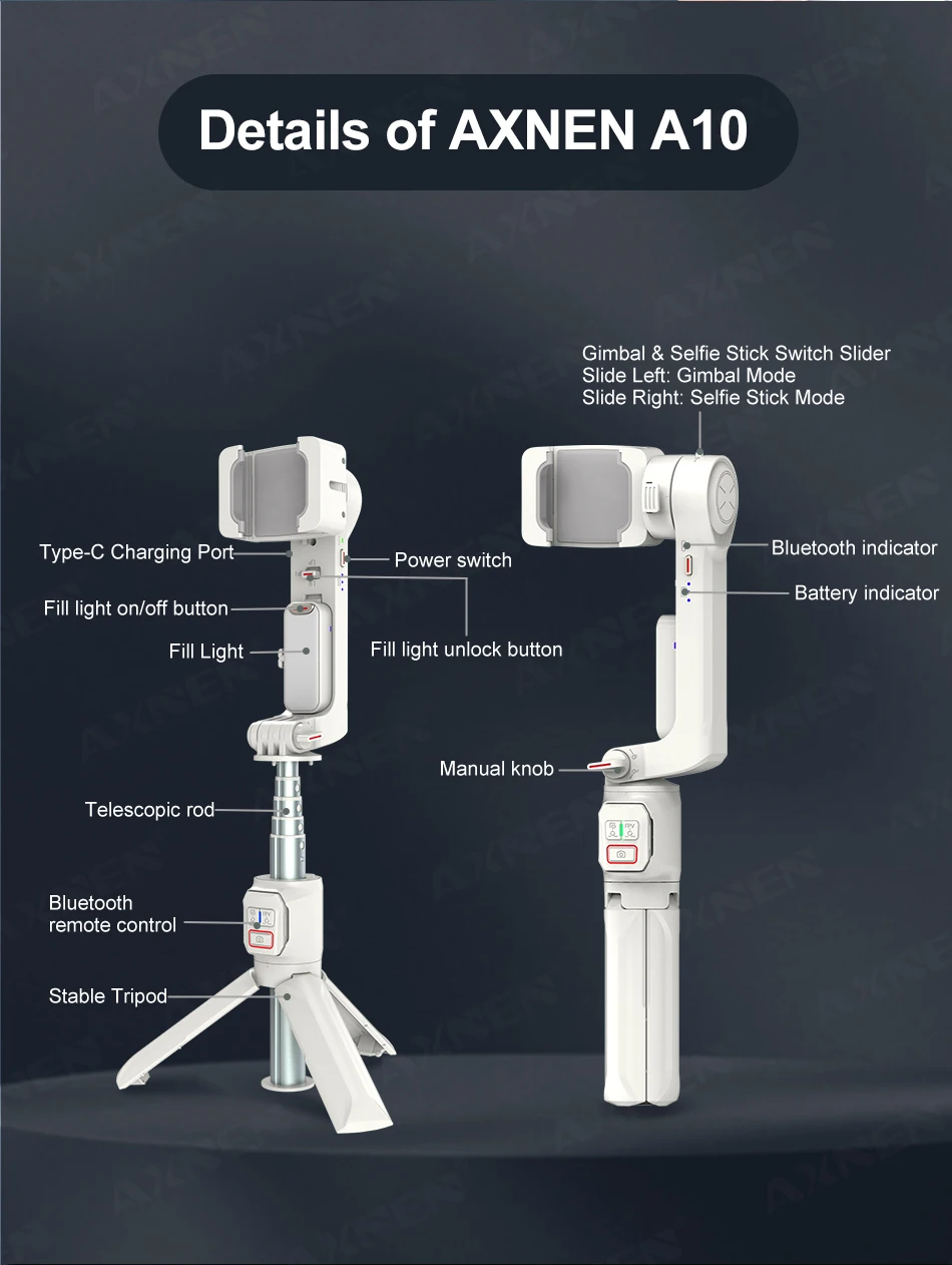 2023 NEW AXNEN A10 Gimbal Stabilizer Selfie Stick Tripod Smartphone Handheld Gimbal with Fill Light Telescopic Rod Vlog Video Record for iPhone Xiaomi Samsung huawei